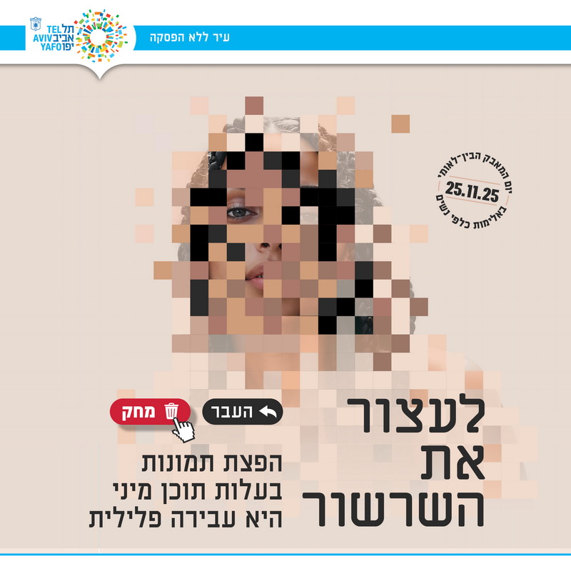 לרגל היום הבין-לאומי למאבק באלימות כלפי נשים שחל ב-25 בנובמבר, עיריית תל אביב-יפו מובילה מהלך עירוני רחב היקף תחת הכותרת "לעצור את השרשור", שמטרתו להיאבק באלימות מינית במרחב הדיגיטלי, תופעה הולכת ומתרחבת שמותירה פגיעות עמוקות בנפגעות ובנפגעים. המהלך כולל קמפיין עירוני נרחב, לצד שורת פעילויות חינוכיות, קהילתיות וציבוריות שיתקיימו ברחבי העיר.